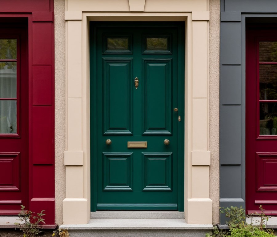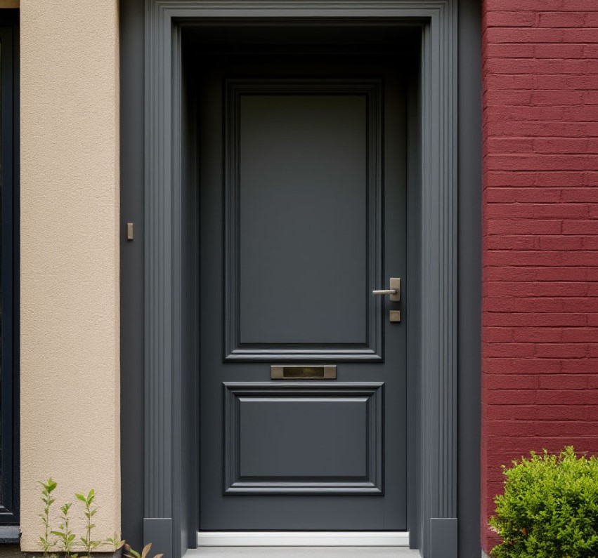 Цвет двери напрямую влияет на восприятие фасада. В 2026 году актуальны два направления: спокойные натуральные оттенки и яркие контрастные акценты. Спокойные цвета — серый, бежевый, графит, матовый черный — создают гармонию с фасадом, подчеркивают статус и стильность. Яркие акценты — бордовый, темно-синий, изумрудный — применяются для смелых дизайнерских решений, чтобы дверь стала центральным элементом экстерьера. Интересная тенденция — комбинирование двух оттенков на одной двери: основной спокойный фон и контрастные вставки или декоративные линии, создающие динамику и визуальный интерес.
